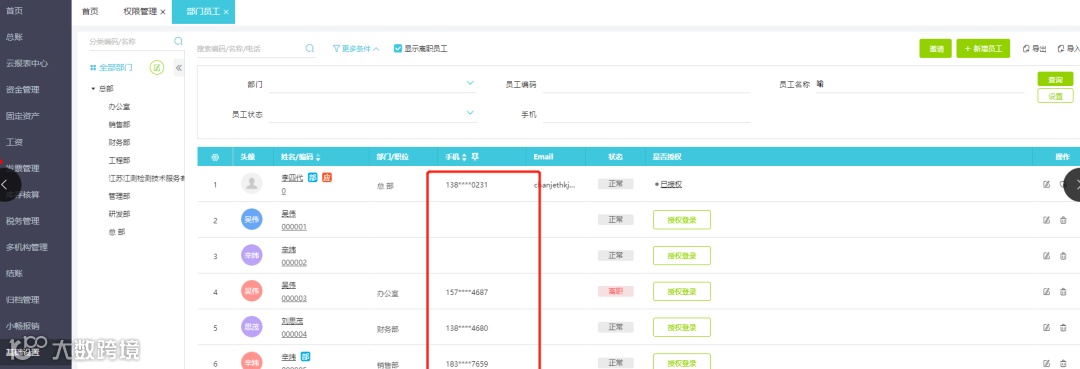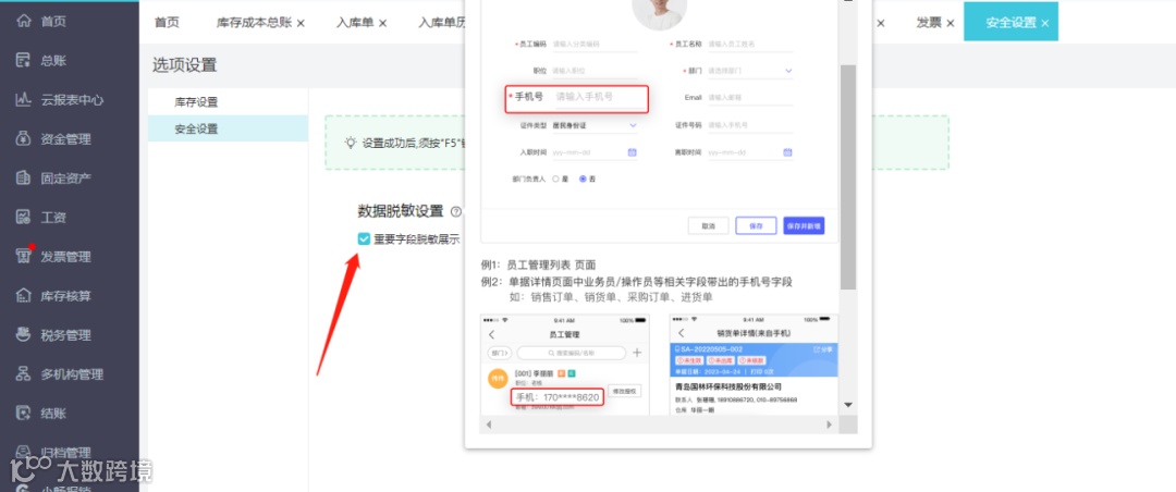 设置/基础设置-安全设置,勾选重要字段脱敏展示,可隐藏员工的相关手机号部分数据: