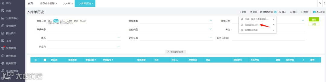 2.库存单据历史、明细账新增历史显示打印功能