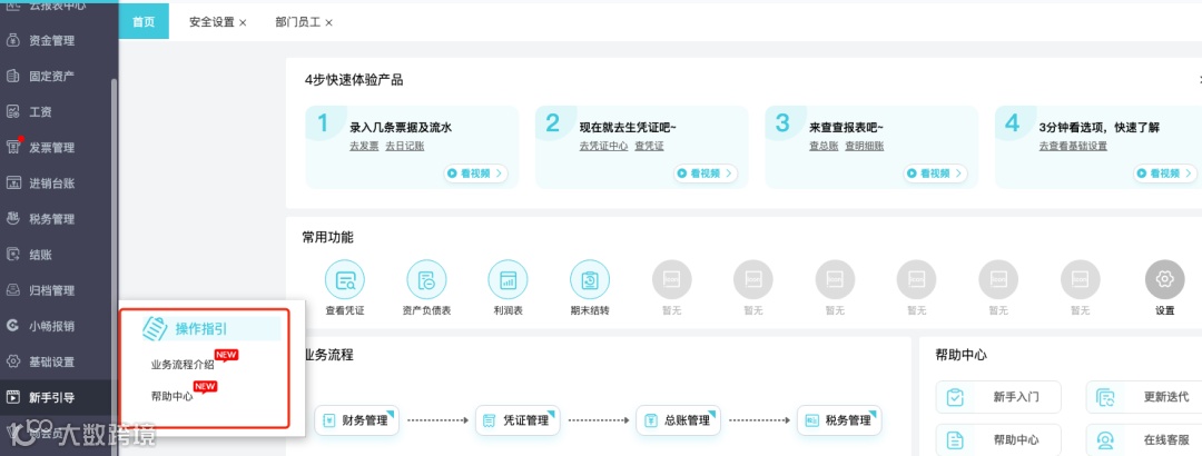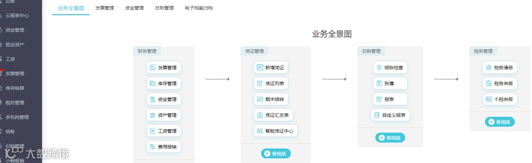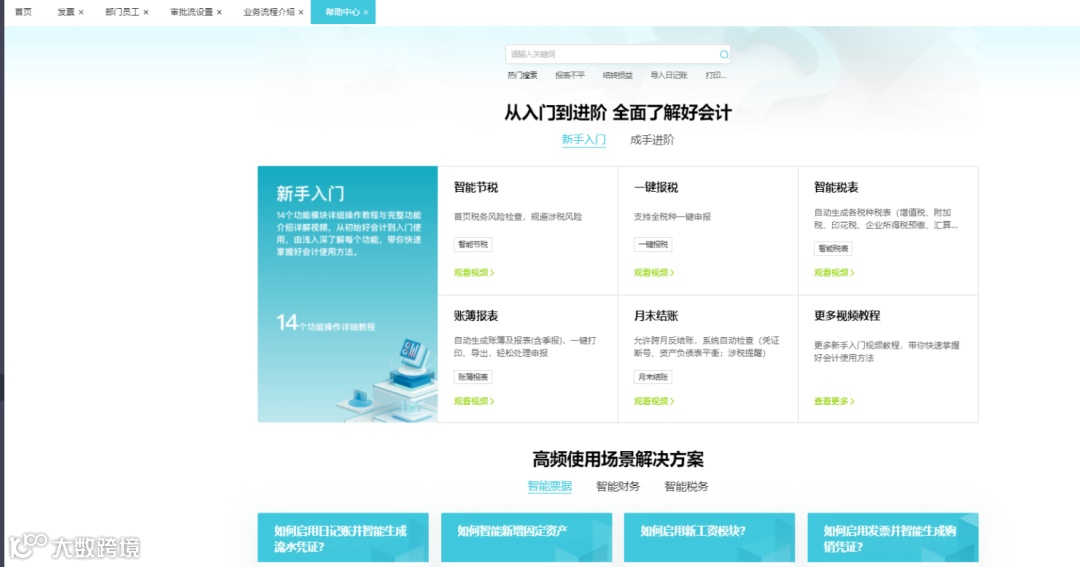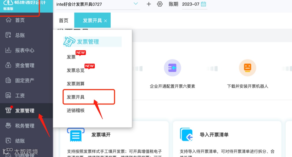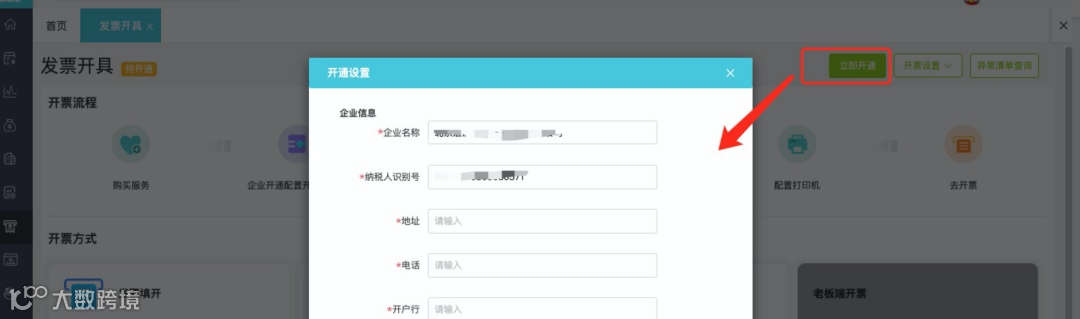 发票管理增加【发票开具】菜单,点击【立即开通】,录入企业开票六要素信息及税盘信息完成账套开通: