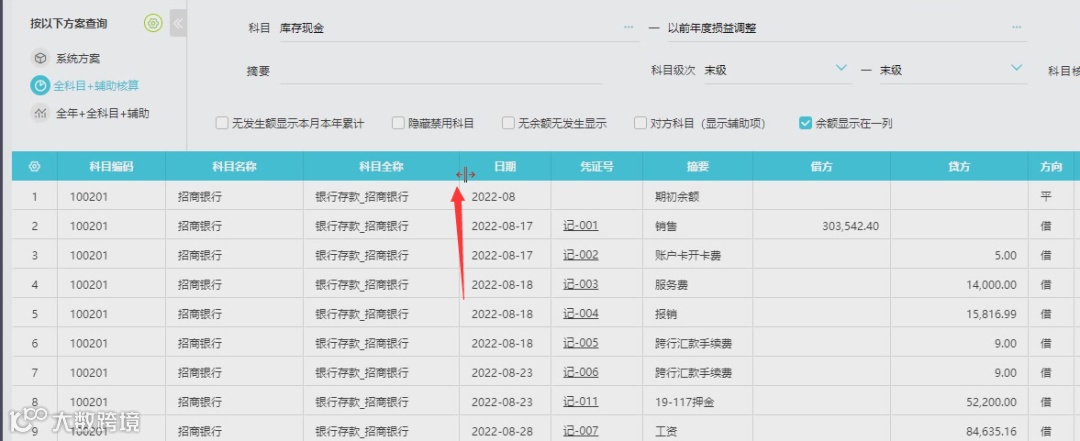 为了解决传统软件中科目名称显示不全的问题,新型财务软件(好会计)允许用户自由调整列宽。只需将鼠标放在列的边缘,然后拉拽即可。