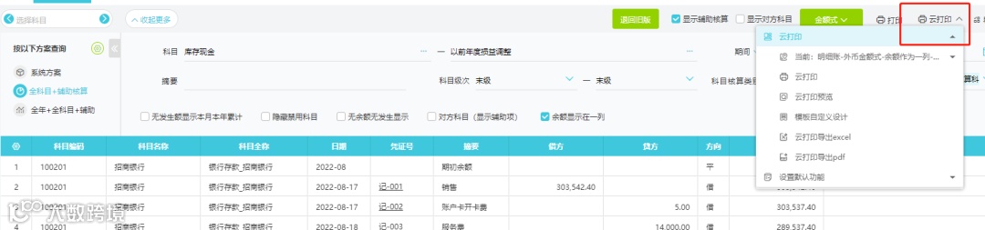 在【总账】-【明细账】中选择“云打印”选项;