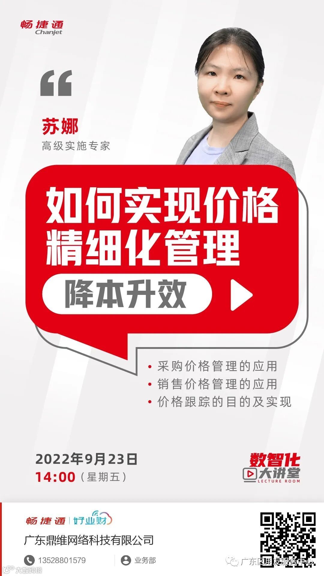 09月23日(周五)下午14:00 相约线上分享会 高级实施专家 苏娜 老师给大家分享《如何实现价格精细化管理,降本升效》。