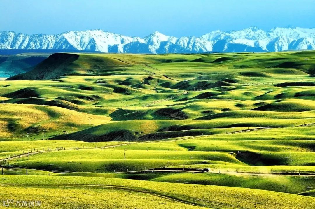 每年7、8月间,与草原相接的祁连山依旧银装素裹,而草原上却碧波万顷,马、牛、羊群点缀其中。