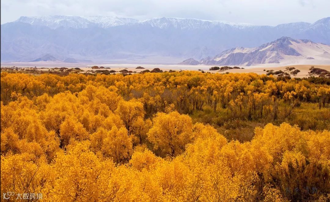 胡杨林南靠巍巍昆仑山脉,北面是茫茫戈壁盐滩,夹在其中的沙漠化地带里,尤其显得珍贵。