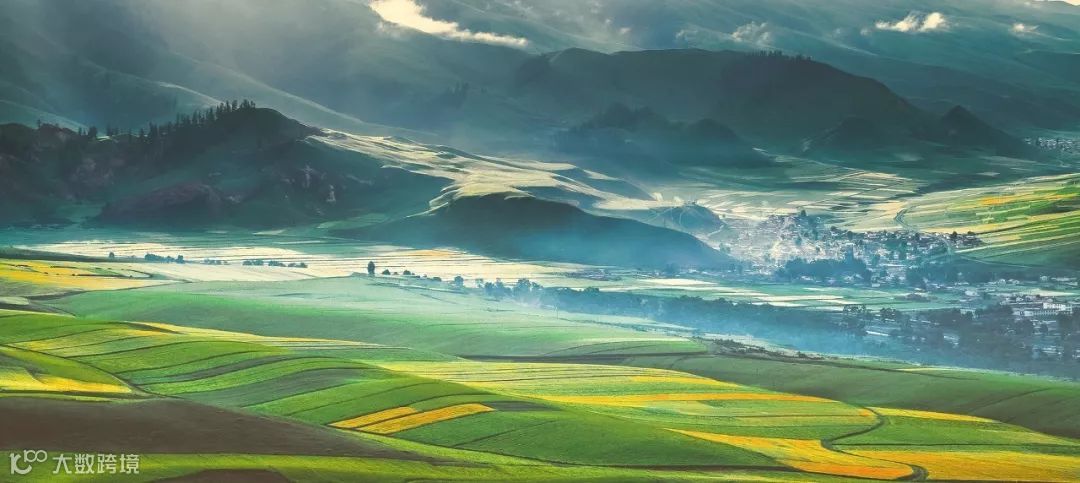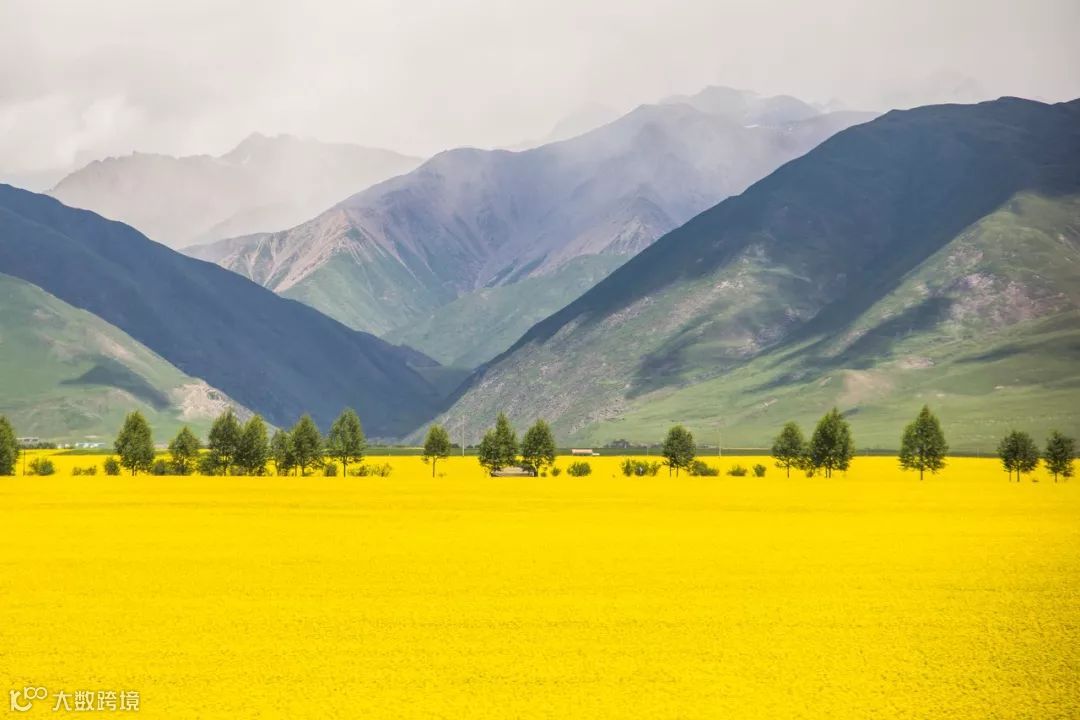 明黄的油菜花,碧绿的青稞,大色块交织在一起,如天地织锦,层层叠叠,波澜壮阔。
