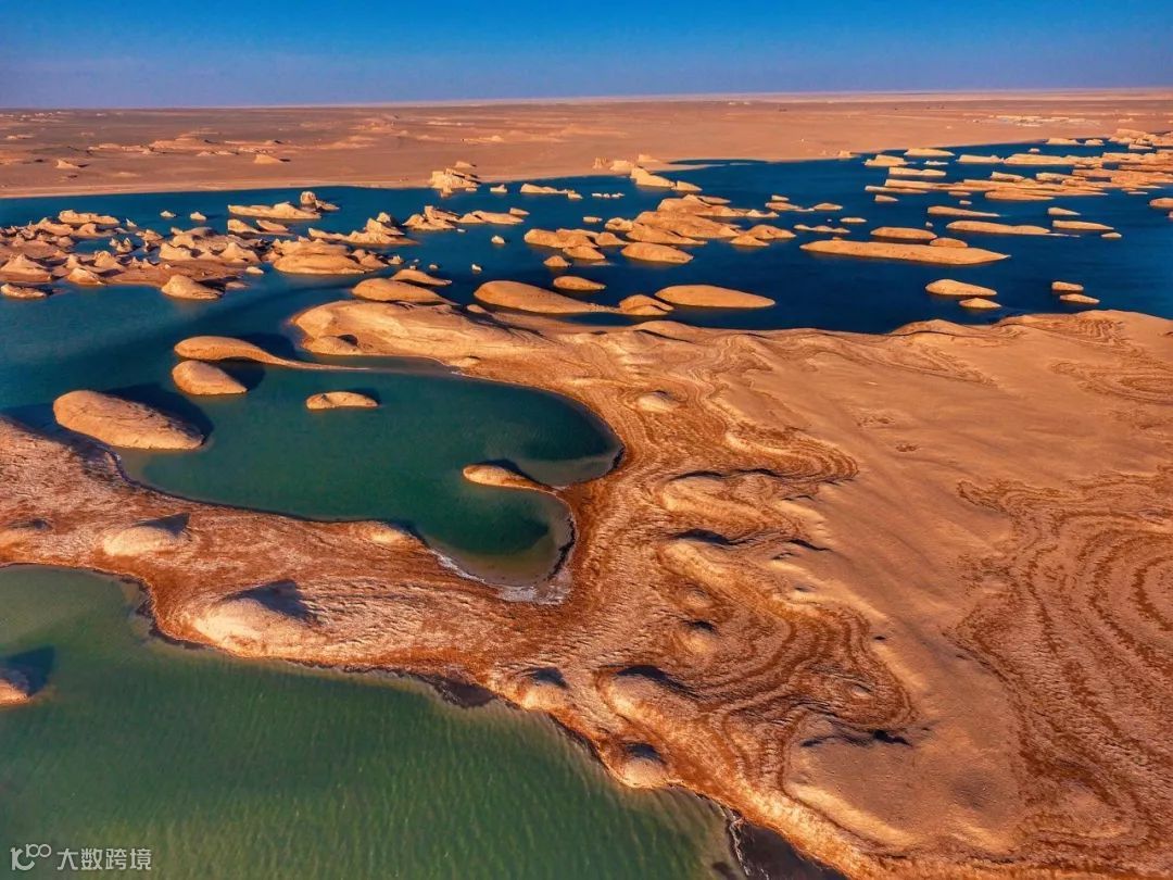 这里的水是湛蓝色的与大海无差别,这里的景致仿佛跨越了时空和时间的束缚,宛若来到了外星世界。