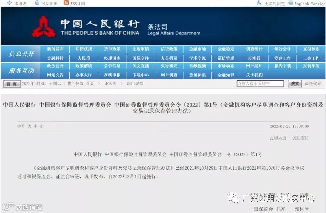 《金融机构客户尽职调查和客户身份资料及交易记录保存管理办法》已经2021年10月29日中国人民银行2021年第10次行务会议审议通过和银保监会、证监会审签,现予发布,自2022年3月1日起施行。
