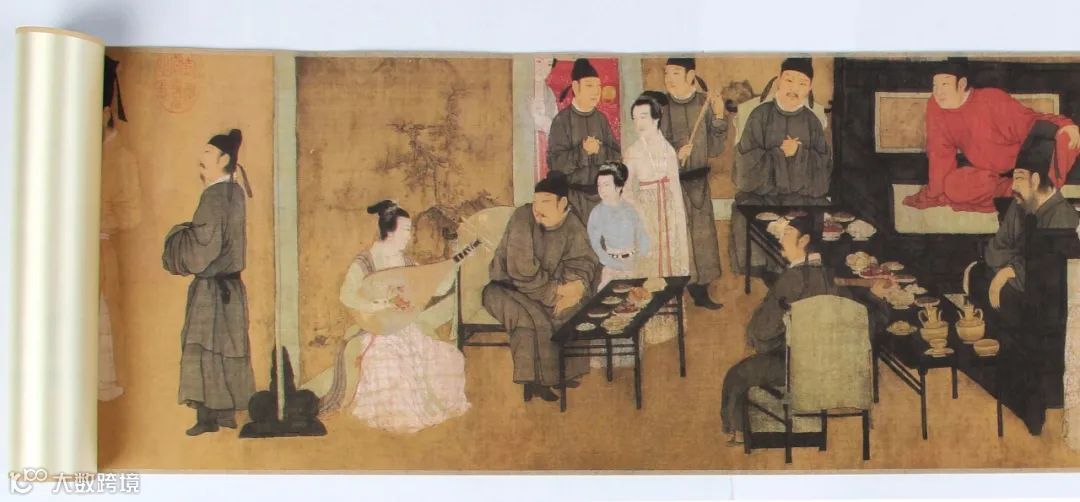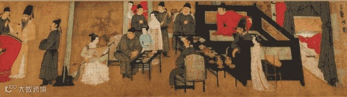 该作品细致地还原了宴会上弹丝吹竹、清歌艳舞、主客揉杂、调笑欢乐的热闹场面。全卷以连环画的形式表现各个情节,每段以屏风隔扇加以分割,又巧妙地相互连结。