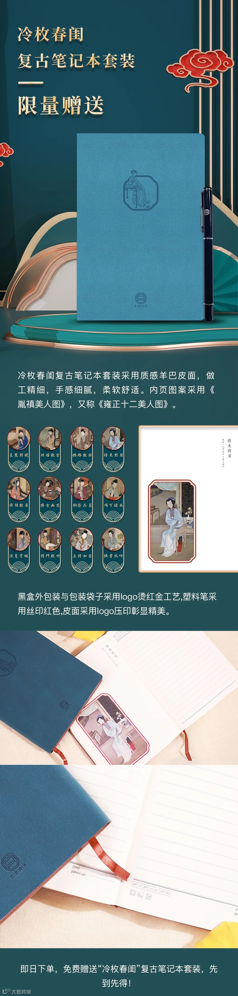 即日起,购买故宫国画宝藏套装中任意一件,赠送价值58元《冷枚春闺复古笔记本》一套,先到先得,赠完即止。