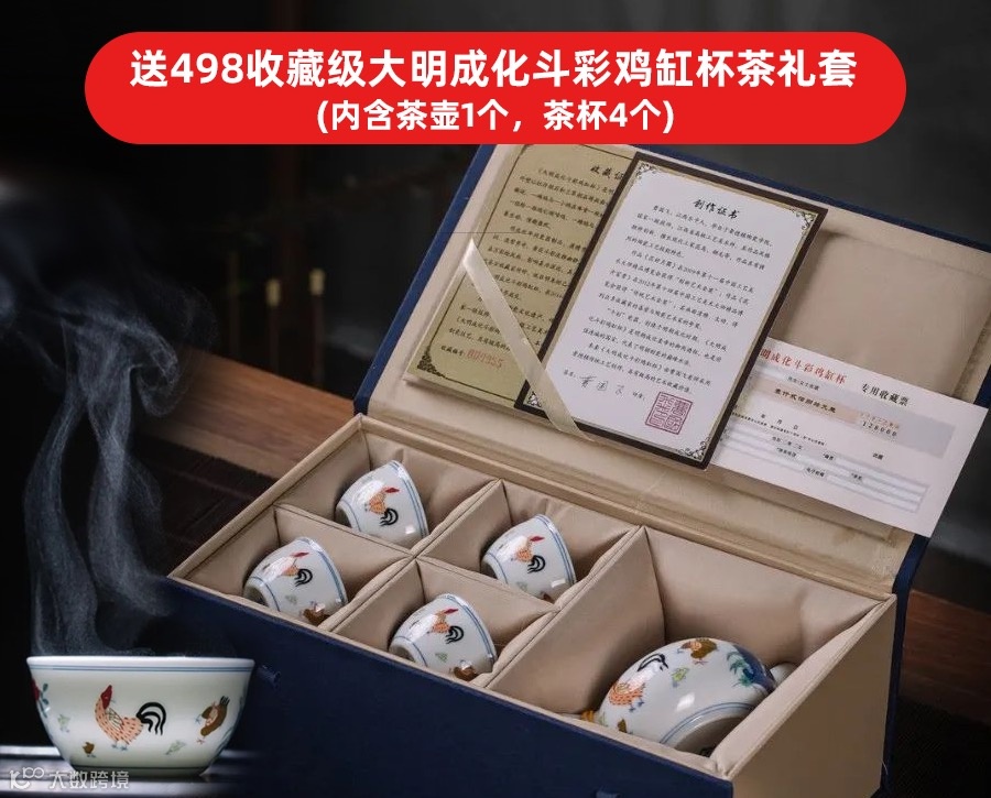 《大明成化斗彩鸡缸杯》茶礼为国家一级技师、江西省高级工艺美术师曹国飞老师匠心巨制,内含茶壶1个,茶杯4个,一张收藏证书和一张曹国飞老师的创作证书,为收藏保驾护航。