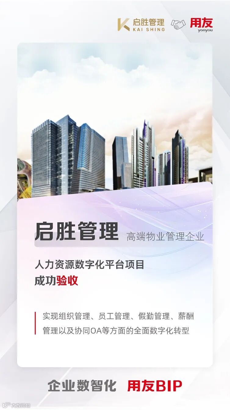 近日,由用友承建的启胜管理服务有限公司(简称“启胜管理”)人力资源数字化平台项目顺利完成验收。此次合作旨在通过构建一个集成化的人力资源管理系统,实现启胜管理在组织管理、员工管理、假勤管理、薪酬管理以及协同OA等多方面的全面数字化转型,并支持PC端和移动端的无缝应用,优化启胜管理的人力资源及行政管理流程,提高管理效率和决策质量。