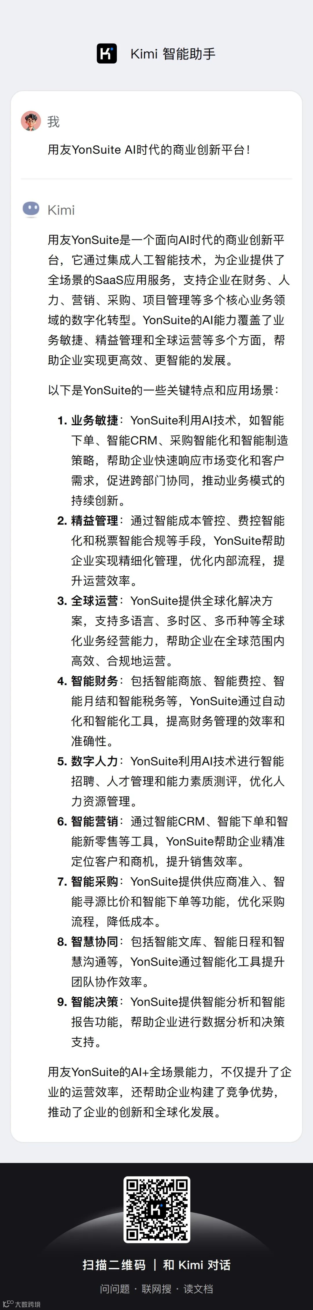 此次合作,不仅是月之暗面 Kimi在数智化转型道路上迈出的坚实一步,也是用友在大模型行业应用的成功实践。双方合作将开启数智化转型的新篇章,共同探索企业发展的新路径,实现共赢发展。
