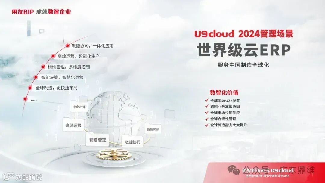 2024年,用友重申了其价值主张,从“企业数智化 用友BIP”升级为“用友BIP 成就数智企业”。对U9 cloud来说,其最终目标是支撑中国制造企业高质量地参与到全球化竞争中,帮助它们实现高水平的全球化运营,助其打造成为数智企业。