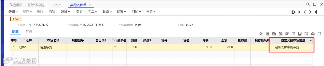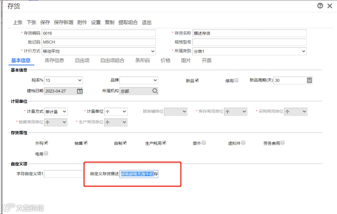 4.此时存货档案中可以看到新增的自定义项,将存货的描述维护进去