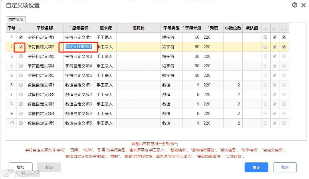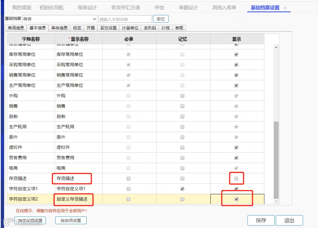 3.将软件原先自带的存货描述取消显示勾选,勾选显示新增的存货自定义项。