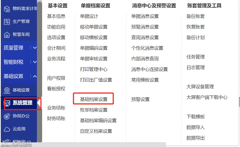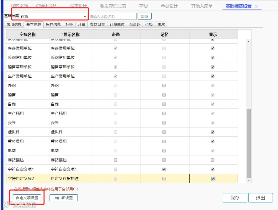 1.点击【系统管理】【基础档案设置】选择存货后点击下方【自定义项设置】
