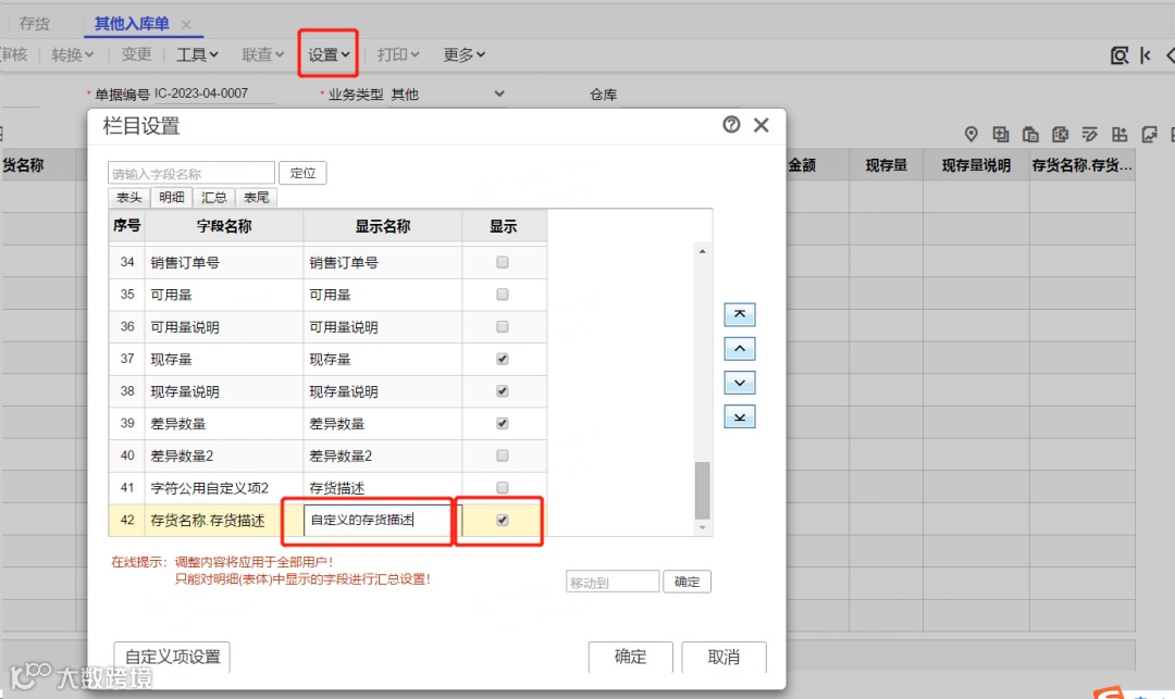5.设置需要显示此描述的单据,勾选显示并自定义为自己想要的名字,此时选择存货后自动带出该存货的描述。