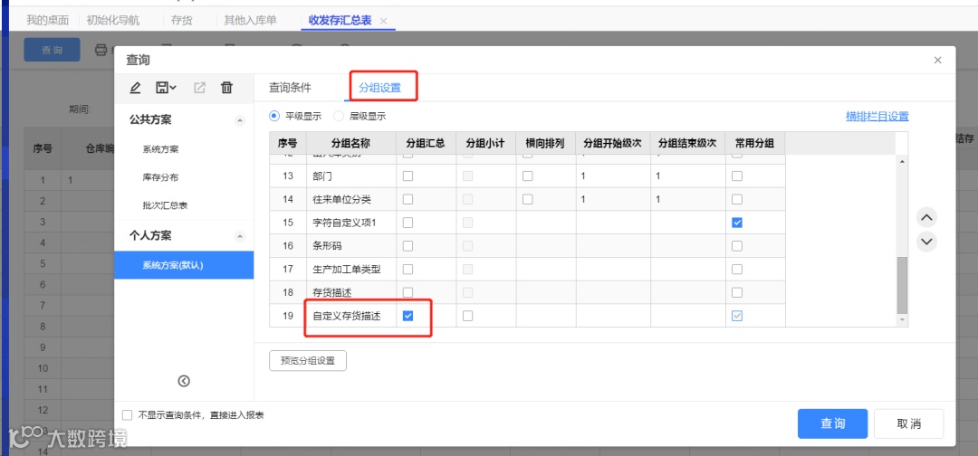 6.查询收发存汇总表时点击【查询】【分组设置】勾选存货描述的分组汇总,此时收发存汇总表可以显示存货的描述。