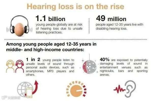 1、全球约有 11 亿年轻人(12~35 岁)因个人音频设备音量过大(如用手机耳机听音乐)而面临不可逆的听力损失!