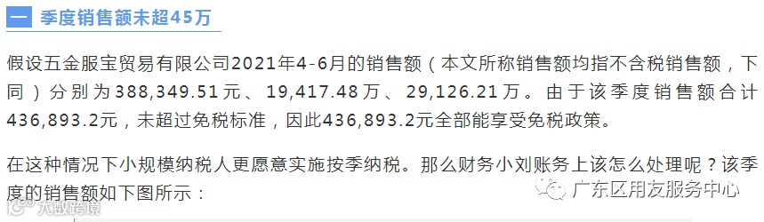 假设某小规模纳税人2021年4-6月的销售额(不含税)分别是388,349.51元、29,126.21元和38,834.95元,由于该季度销售额456,310.67元已超过免税标准,因此,456,310.67元均无法享受免税。该季度的销售额如下图所示: