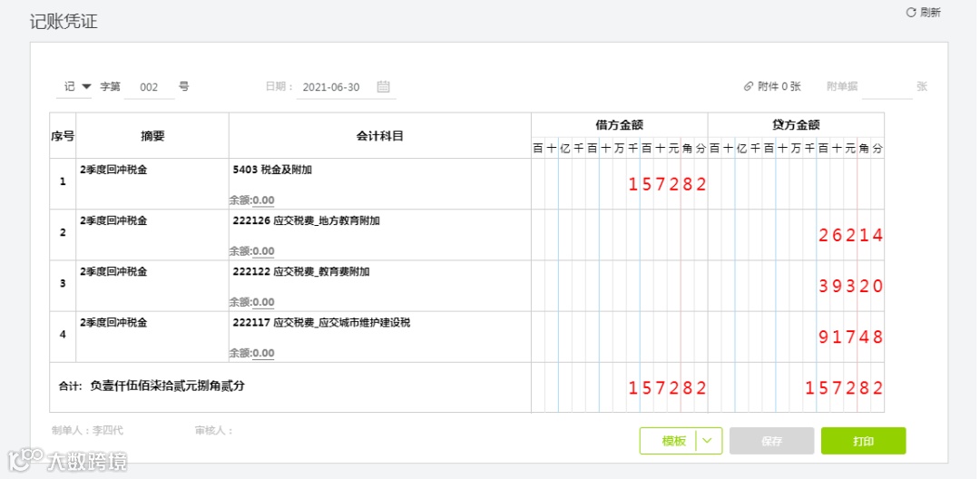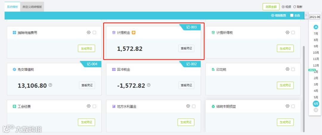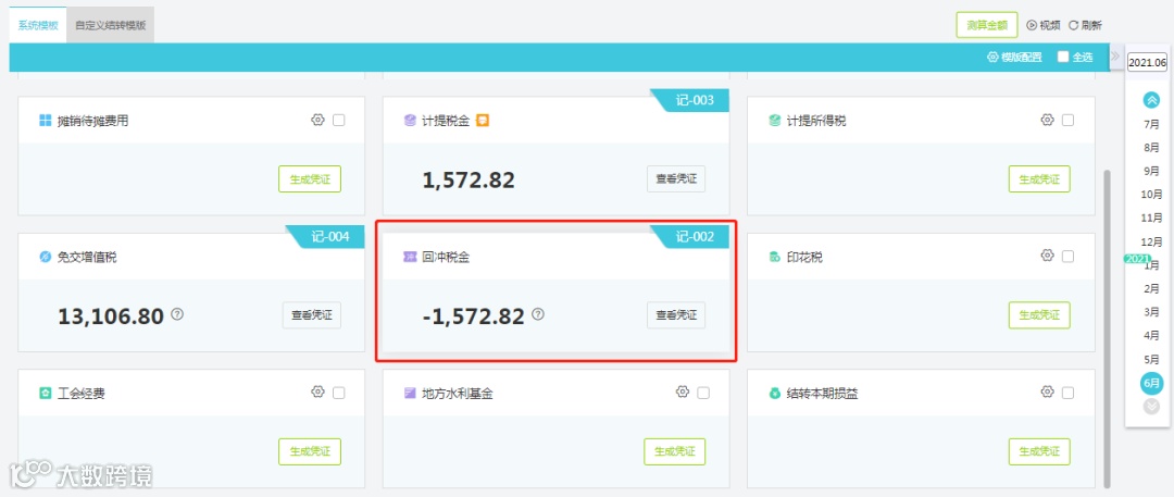 依次点击【结账】-【期末结转】界面,右边的时间轴选择6月份,点击右上角的【测算金额】之后找到【回冲税金】的模板点击【生成凭证】即可。凭证如下图所示。