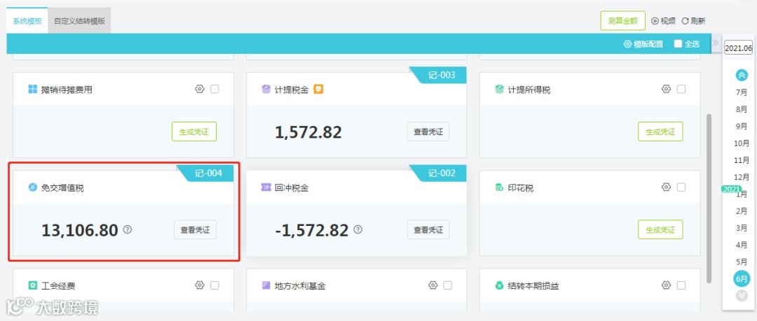 依次点击【结账】-【期末结转】界面,右边的时间轴选择6月份,点击右上角的【测算金额】之后找到【免交增值税】的模板点击【生成凭证】即可。凭证如下图所示。