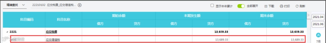 进入好会计界面依次点击【总账】-【余额表】界面点击【简单查找】旁边倒三角的【精确查找】,【科目】选择应交税费;【科目级次】选择1至2级;【期间】选择4-6月份点击查找可知2季度末的应交增值税为13,689.33元,如下图所示: