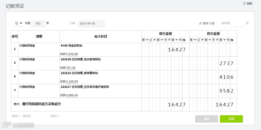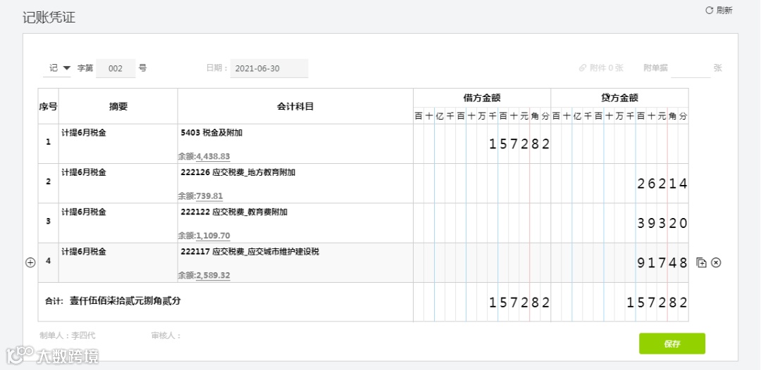 依次点击【结账】-【期末结转】界面,右边的时间轴选择6月份,点击右上角的【测算金额】之后找到【计提税金】的模板点击【生成凭证】即可。凭证如下图所示。