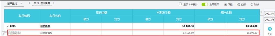 很多用户会疑惑这个数字是怎么来的,我们知道税金及附加的计税依据是应交增值税,其计算原理为应交税费-地方教育费附加=13,106.80*2%=262.14元,应交税费-教育费附加=13,106.80*3%=393.20元,应交税费-应交城市维护建设税=13,106.80*7%(税率可手工修改)=917.48元。