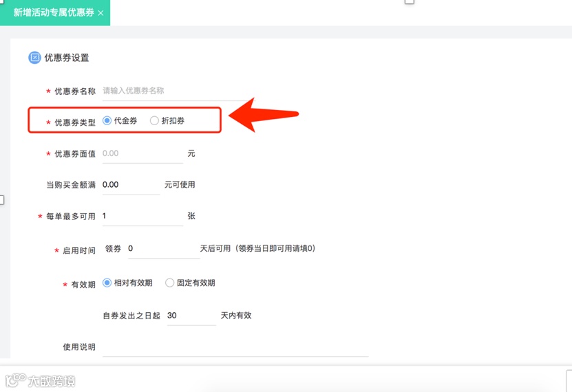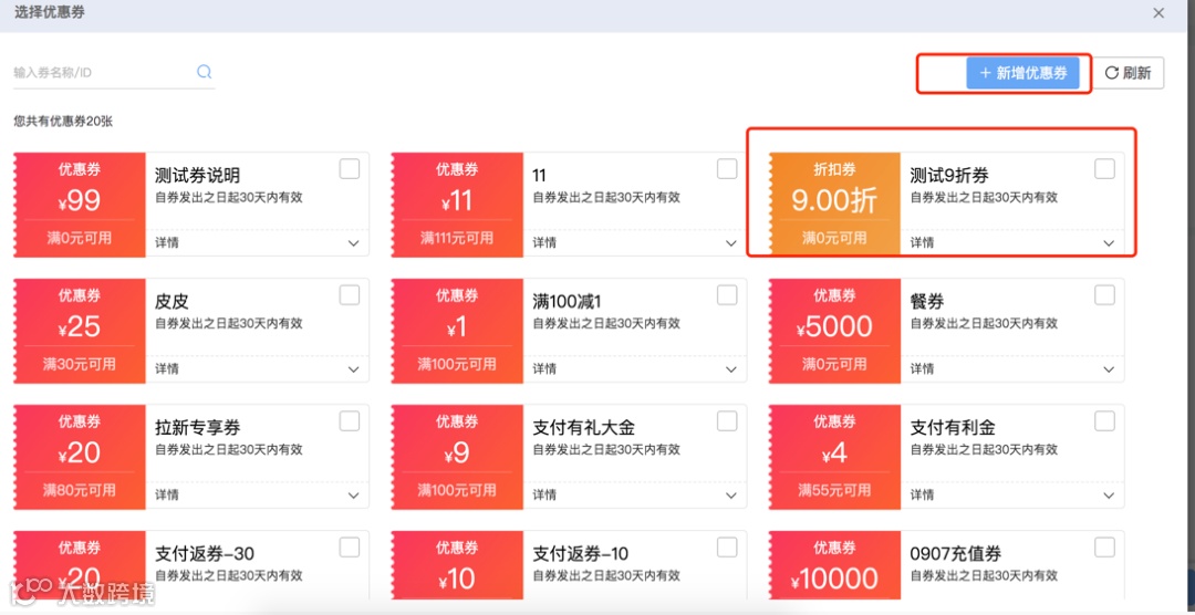 创建【新客赠券】、【邀请有礼】时,选择优惠券的弹窗,会出现代金券和折扣券;以及选择优惠券的右上角的【新增优惠券】,可以创建【折扣券】。