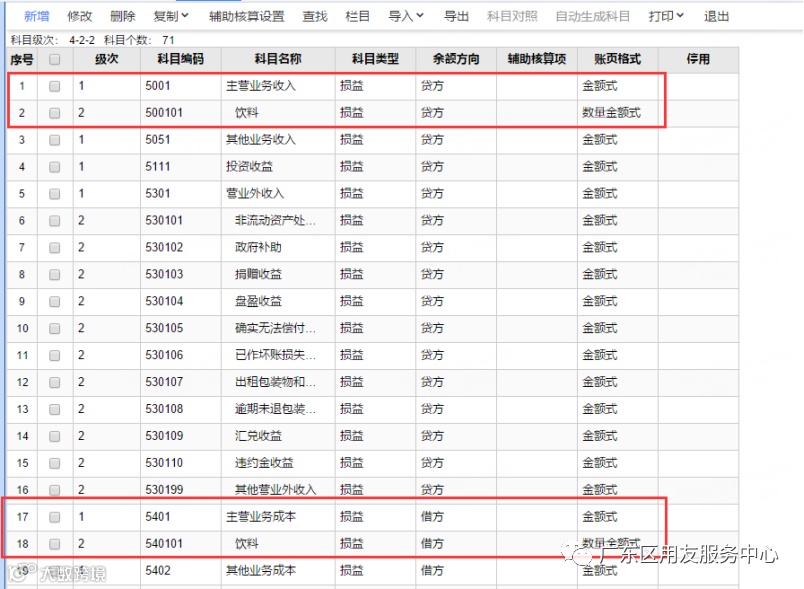 进入会计科目档案,对库存商品,主营业务收入,主营业务成本设置同样的下级科目,如图所示: