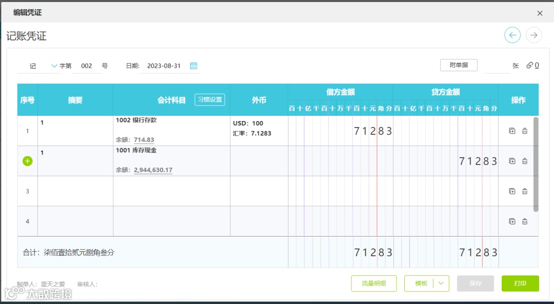 使用模板后,输入对应的金额即可。常用凭证可以根据具体业务的相似度进行修改或新增,明细科目、辅助核算项目、金额等信息也可以保存。