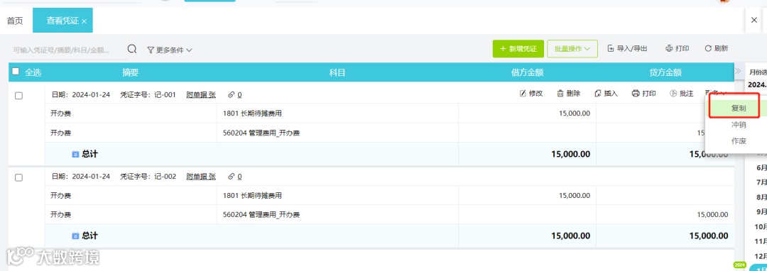 以长期待摊费用为例,找出上月做的开办费摊销的凭证,点击【更多】-【复制】,修改凭证录入日期,保存即可。