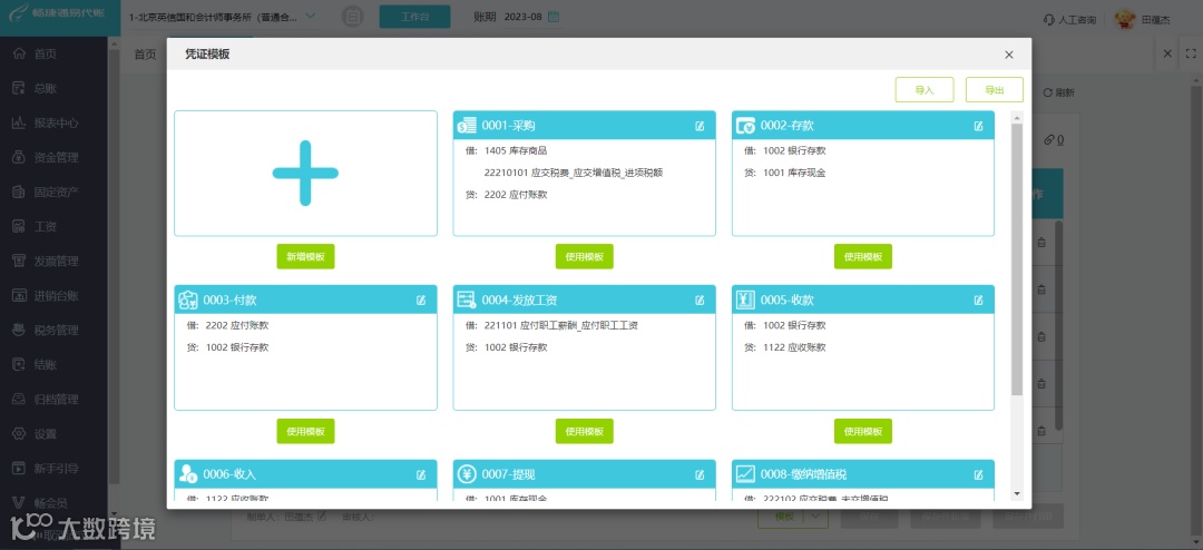使用【模板】功能或快捷键“F4”,调用已有的存款凭证模板,易代账预制了8大常用模版,也可以根据实际公司业务按自己需要新增模版。