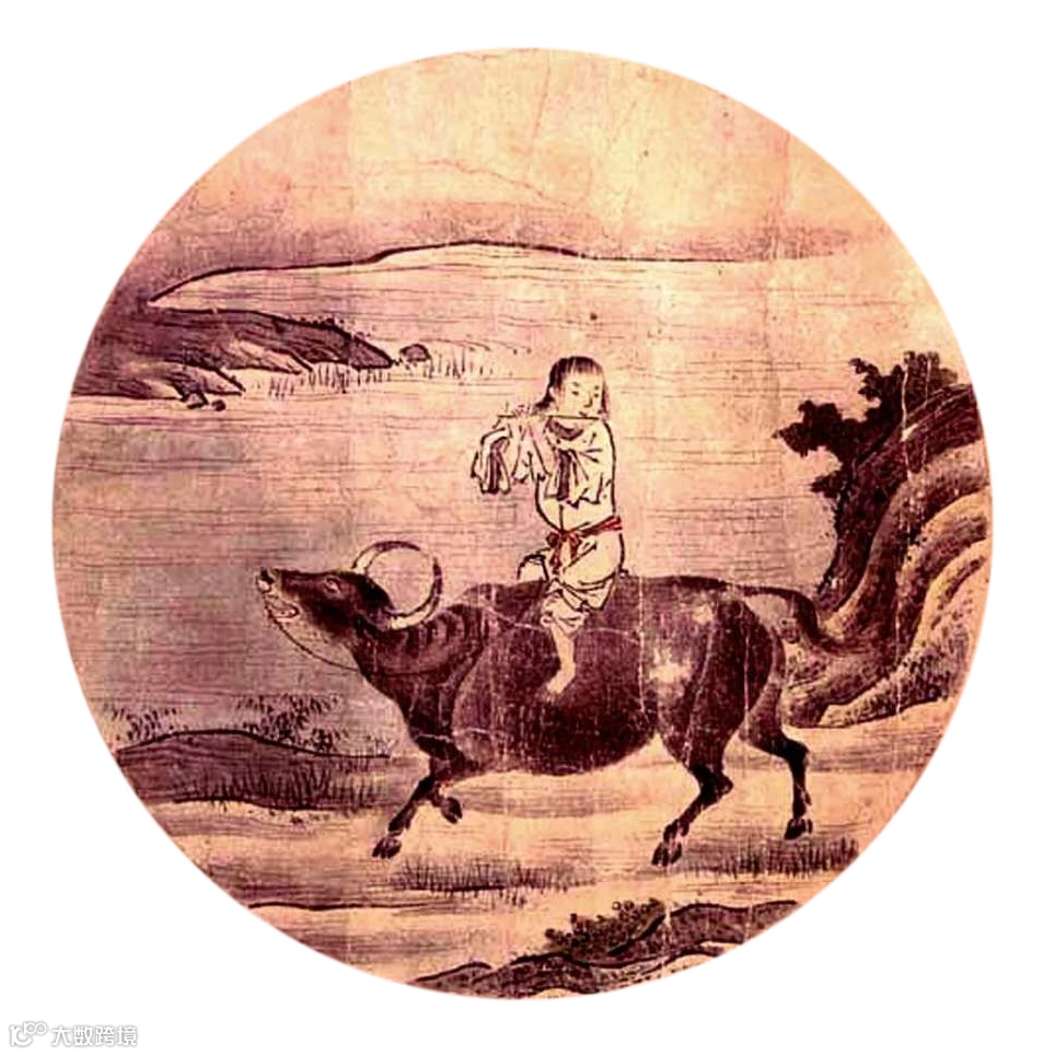 著语:干戈已罢,得失还无。唱樵子之村歌,吹儿童之野曲。横身牛上,目视云霄;呼唤不回,牢笼不住。