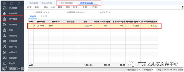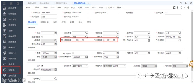 2、2019年2月购买了一年的桌子,进入【初始化】-【期初固定资产卡片】新增一张卡片并点击【资产管理】-【计提折旧与摊销】进行计提折旧;
