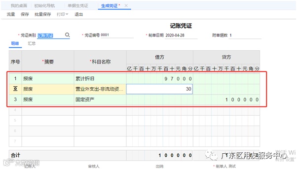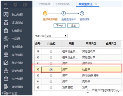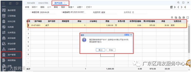 4、2020年4月,桌子被正常报废了,此时做资产处置即可。点击【资产管理】-【业务处理】-【资产处置】,并且会提示是否封存,可以点击是,单据保存之后再进入【总账模块】-【单据生凭证】去选择资产处置单进行生成。