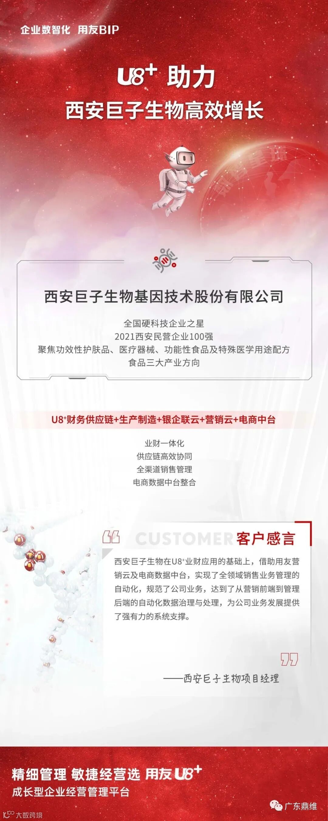 巨子生物是用友10多年老客户,从公司成立起就一直使用用友系统。用友凭借U8+ 财务供应链 + 生产制造 + 银企联云 + 营销云一体化平台优势,为巨子生物量身打造了一套适配的企业管理系统,支撑其业务不断扩张与发展的需要,凭借云 + 端的创新应用,为巨子生物在数字化转型方面注入了全新活力。