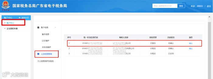 3.开票员以“个人”身份登录电子税务局→进入【账户中心】→【人员权限管理】,在操作栏点击“确认”,授权成功。