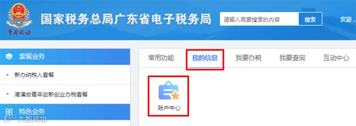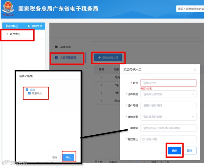 1.法人、财务负责人或有管理权限的办税员登录广东省电子税务局网页端→进入首页【我的信息】→【账户中心】→【人员权限管理】→【添加办税人员】。