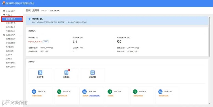 数据概览主要功能:显示纳税人的授信额度、纸质发票情况、本月蓝票开具情况,方便纳税人在开具发票前,作为参考。