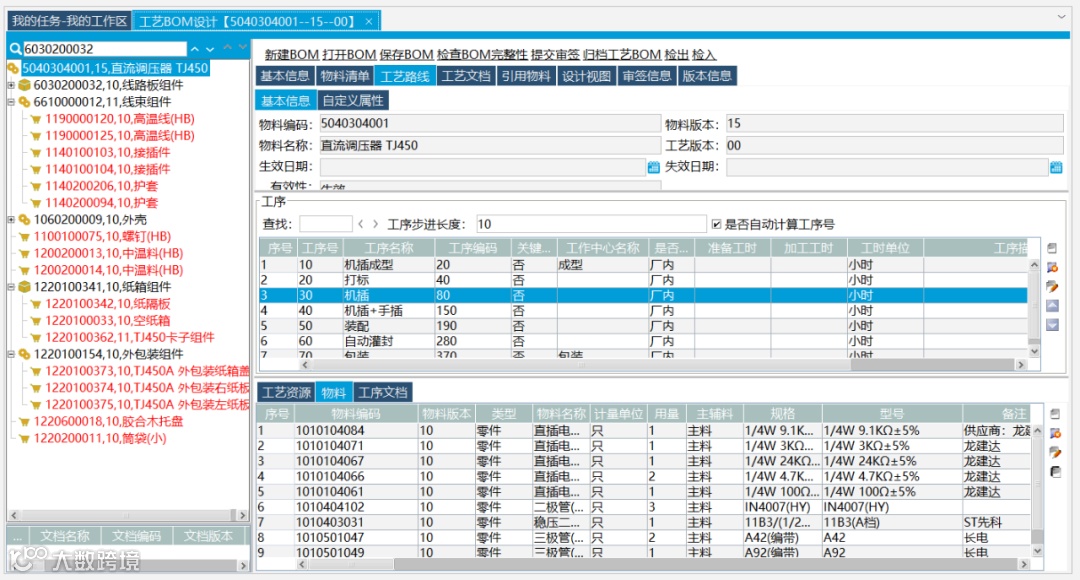 产品工艺管理实现工艺BOM自动继承设计BOM信息;工艺BOM结构可根据工艺业务要求进行调整;支持基于工艺BOM的材料定额计算;支持基于工艺BOM进行任务分配;支持大路线(一级分工)、工序级工艺路线(二级分工)的工艺路线管理。成为设计到产品之间必不可少的纽带。
