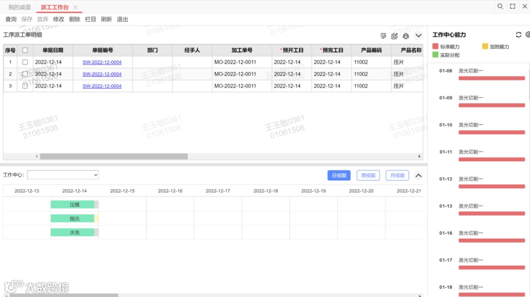 解决汽配行业复杂工序管理,车间对工序进行派工,派工时,可以设置是否按照工序领料,可以进行批量派工、对已派工任务进行调整,可展示待派工任务、各机台已派工任务、各机台可用能力。