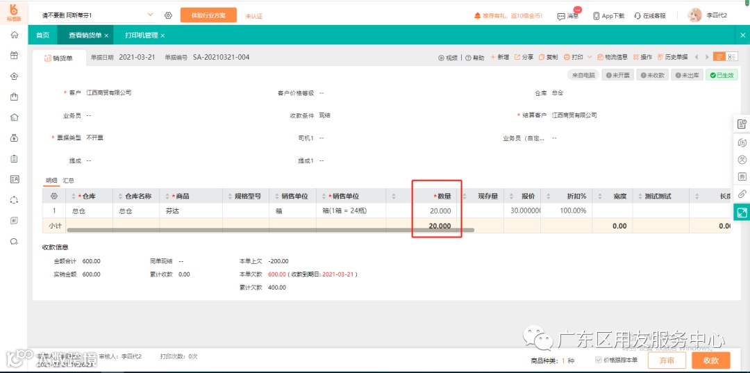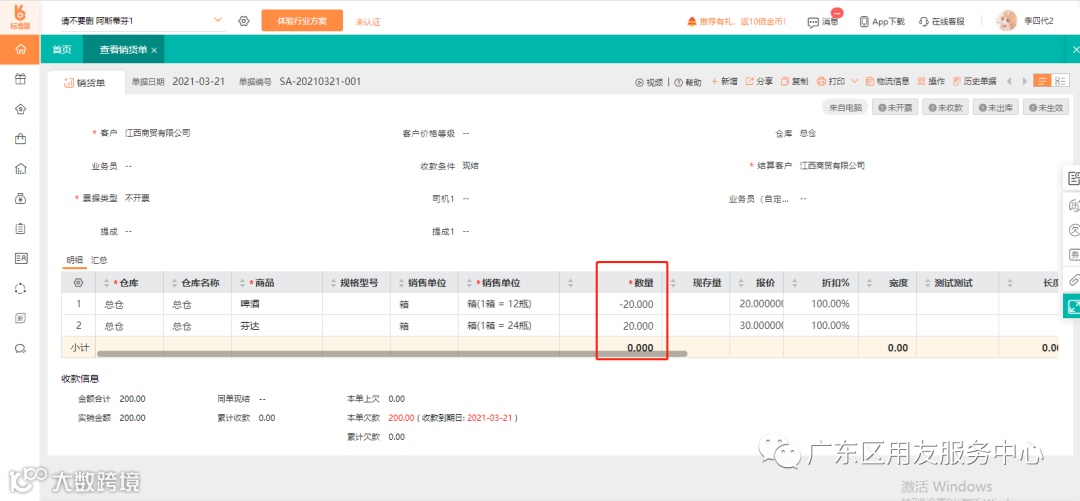 1、在销货单中录入20箱啤酒的负数数量,录入20箱芬达的正数数量,由于芬达是30元一箱,啤酒是20元一箱,退换货后这张销货单确认200元的应收款。