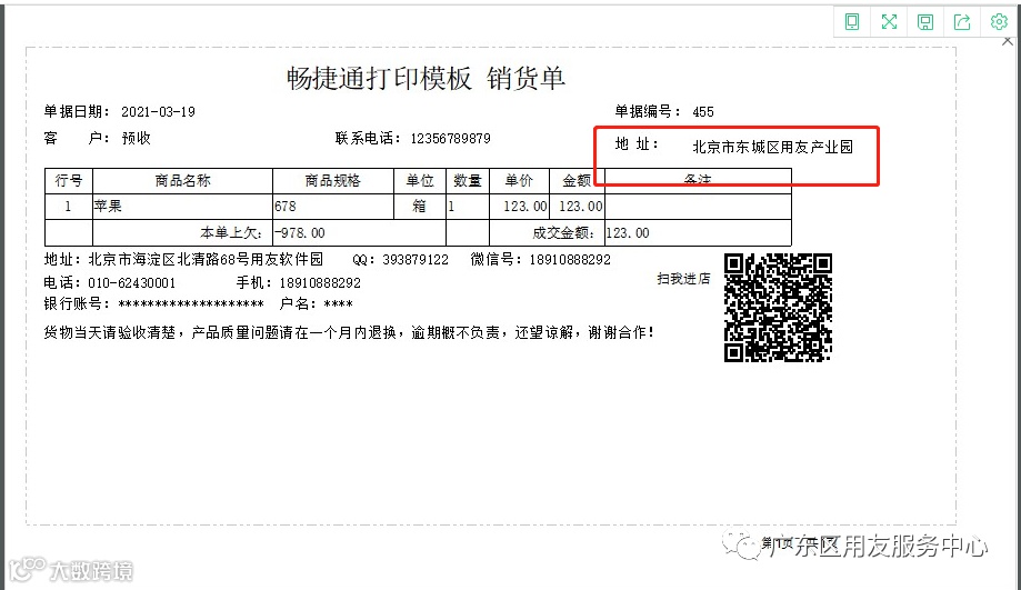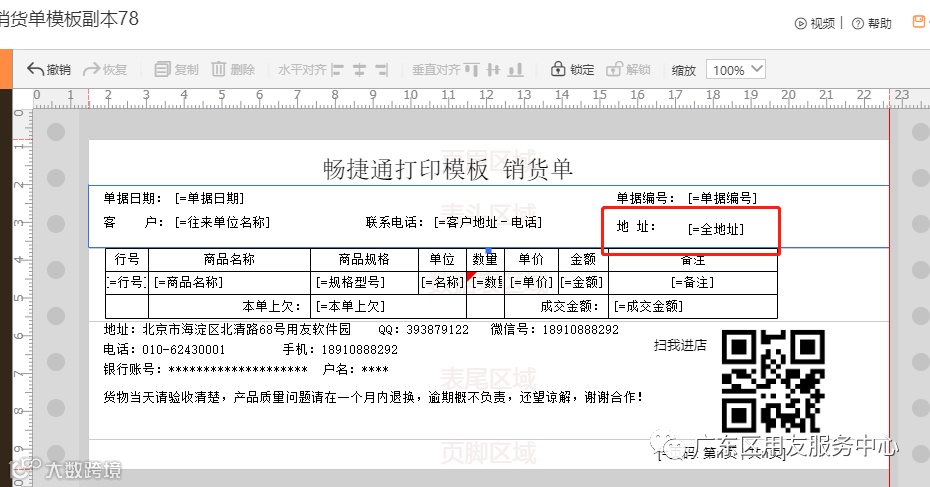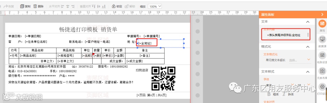 需要把销货单上面客户地址打印出来,打印模板上面客户地址需要选择到【全地址】这个字段,因为关于地址字段很多,一定是需要选择到这个字段。