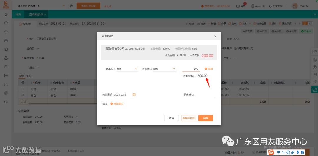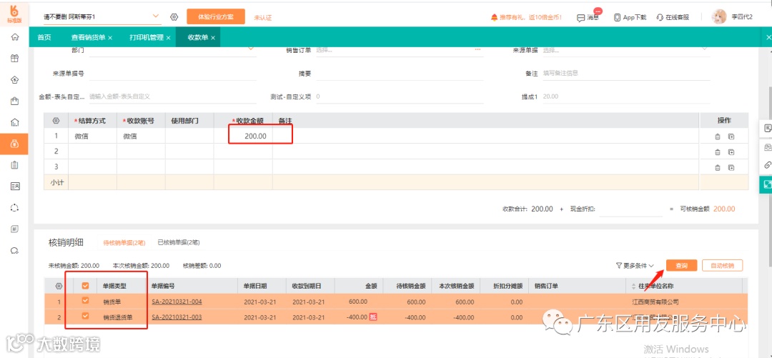 2、后期在收到款项200元时,只需要对该张销货单确认的200元进行核销。