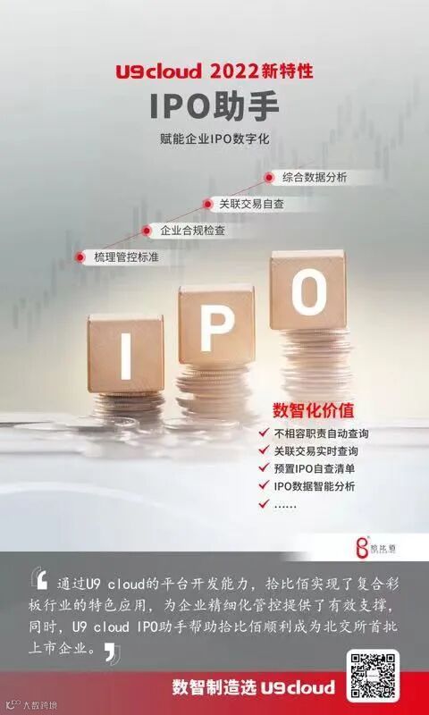 面对这一趋势,用友U9 cloud 2022专门打造了IPO助手,帮助企业上市合规。用友U9 cloud已经为制造企业IPO塑造更多业财融合场景,比如以制造业务为核心保障生产经营的合规管理,财务管控集中化满足IPO规范基本要求,多组织管理为IPO企业变革提供灵活支撑,主数据为制造企业提供IPO基础能力。同时,用友U9 cloud基于企业内部控制体系,从不相容职责、关联交易、IPO自查、IPO数据分析四个方面,树立管控标准,让企业做好IPO自我健康检查。