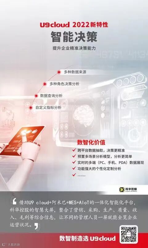 2021年5月,用友U9全面升级到U9 cloud;与U9相比,U9 cloud全面运用移动互联网、大数据、物联网、人工智能等最新技术,融合PLM、智能工厂、AIoT、营销云、采购云、人力云、协同云等服务,可以为成长型企业提供一站式数智化升级方案。