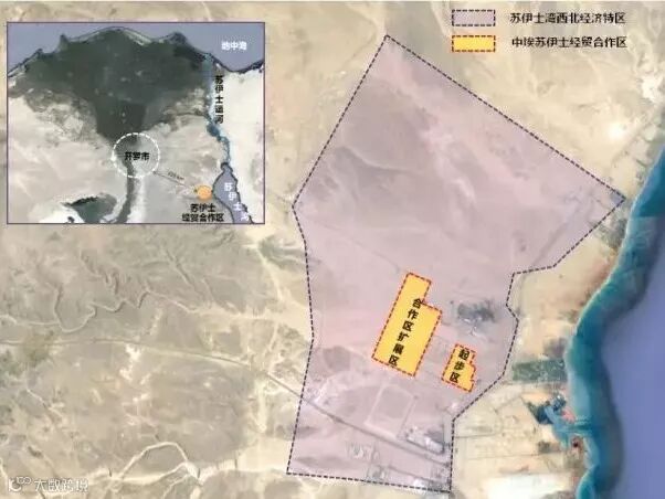 中国·埃及苏伊士经贸合作区位于埃及苏伊士湾西北经济区,紧挨埃及第三大港口—因苏哈那港。近期规划面积7平方公里,起步区面积1.34平方公里,扩展区6平方公里,远期规划面积10平方公里,旨在为中国企业赴埃及投资搭建良好平台。合作区于2009年列入中国国家级境外经贸合作区。