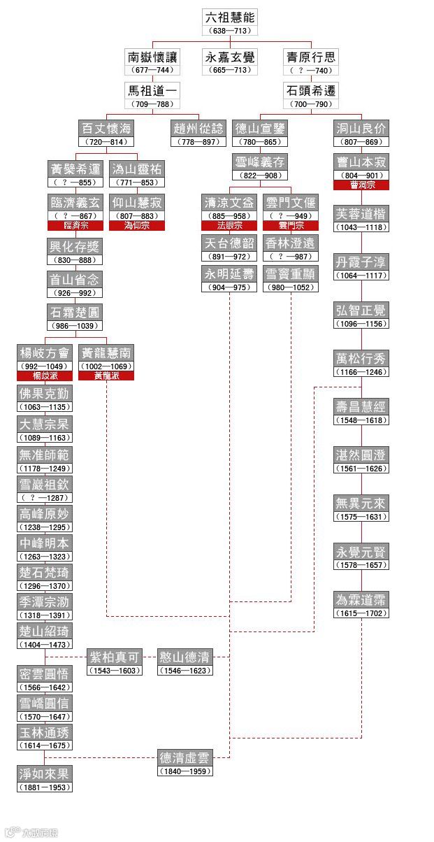 在惠能门下出了南岳怀让、青原行思两位禅门巨匠。在南岳怀让门下,分别形成临济宗和沩仰宗两个宗派。在青原行思门下,形成了曹洞宗、云门宗和法眼宗三个宗派。其中,临济宗门下又分出黄龙派、杨岐派两个支派。由临济宗、沩仰宗、曹洞宗、云门宗、法眼宗等五家,加上由临济宗分出的黄龙派和杨岐派,合称为“五家七宗”。